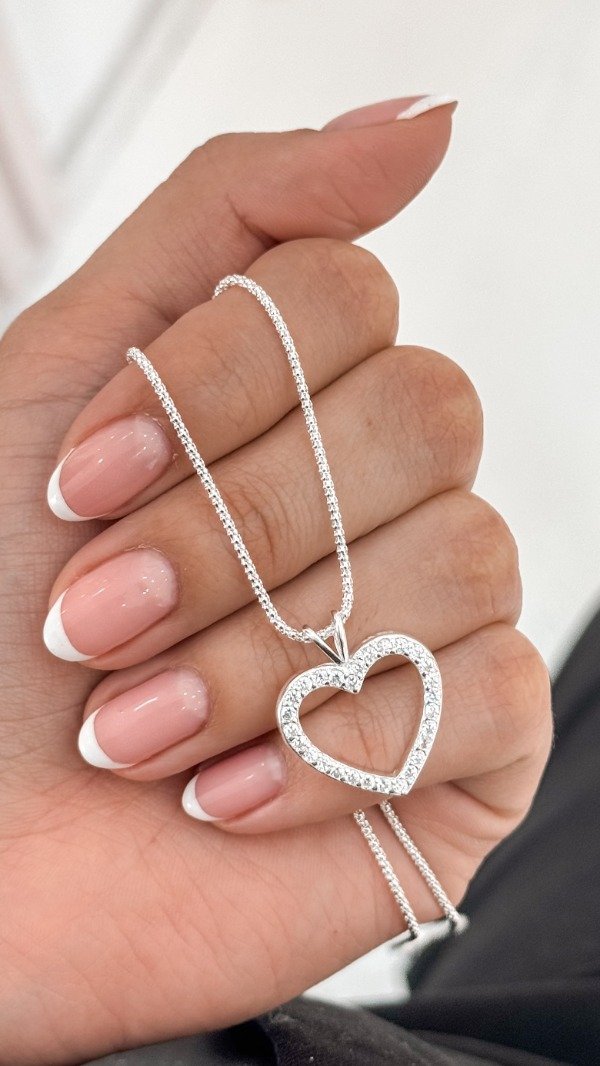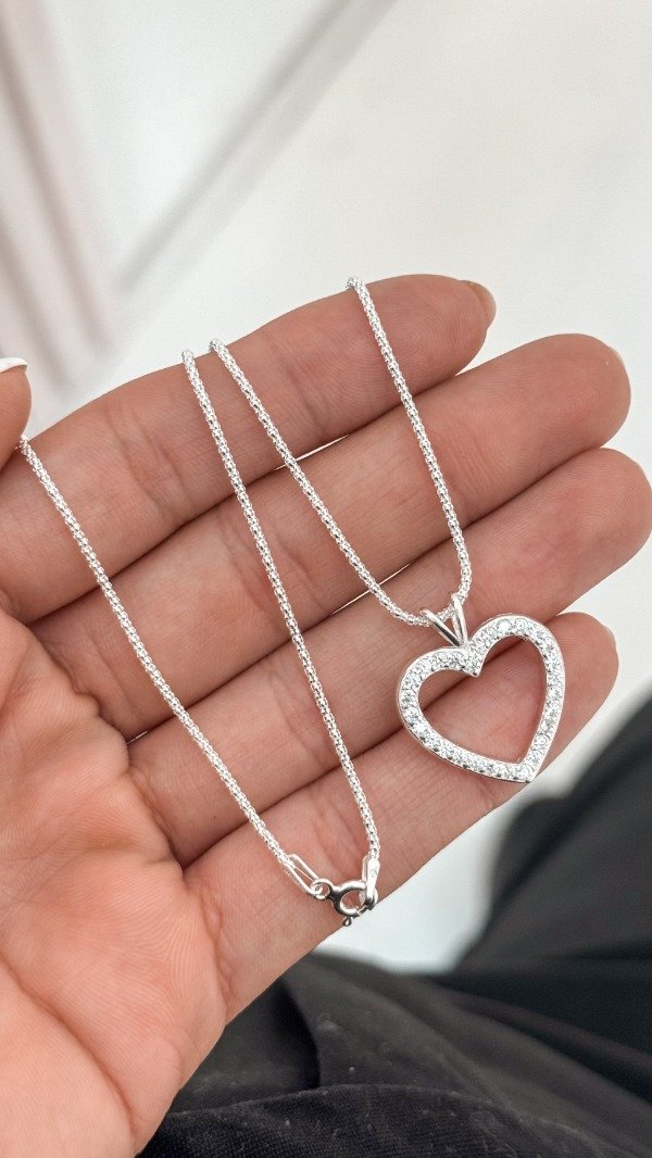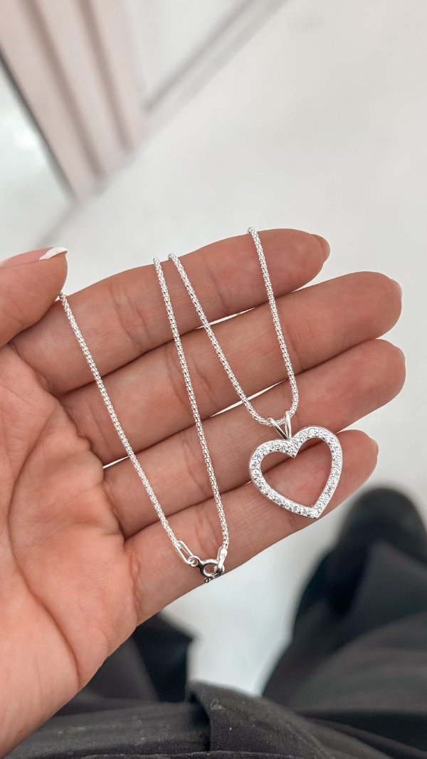 Cadena canasta gruesa liviana de 50 cm, con dije de corazon hueco con strass blanco