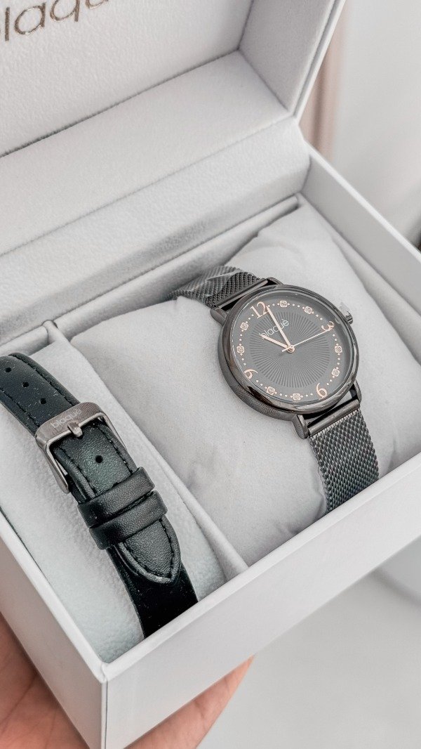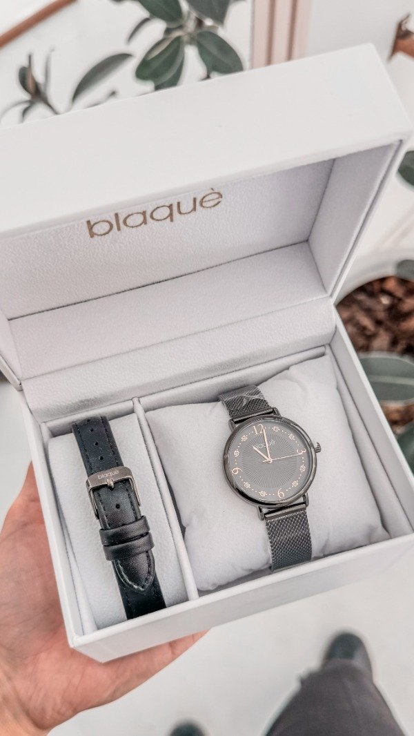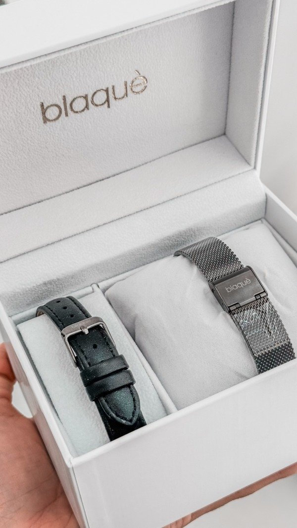 RELOJ BLAQUÉ MALLA TEJIDA DE METAL, CON MALLA DE REGALO NEGRA DE CUERO.