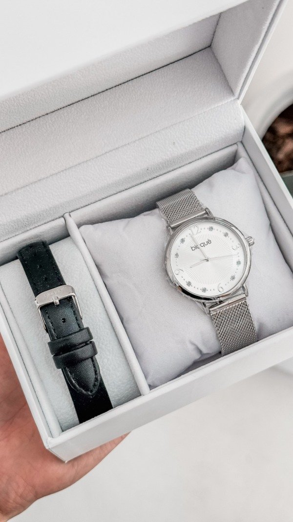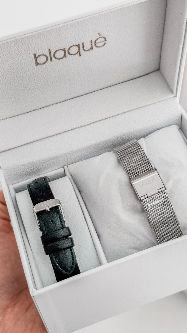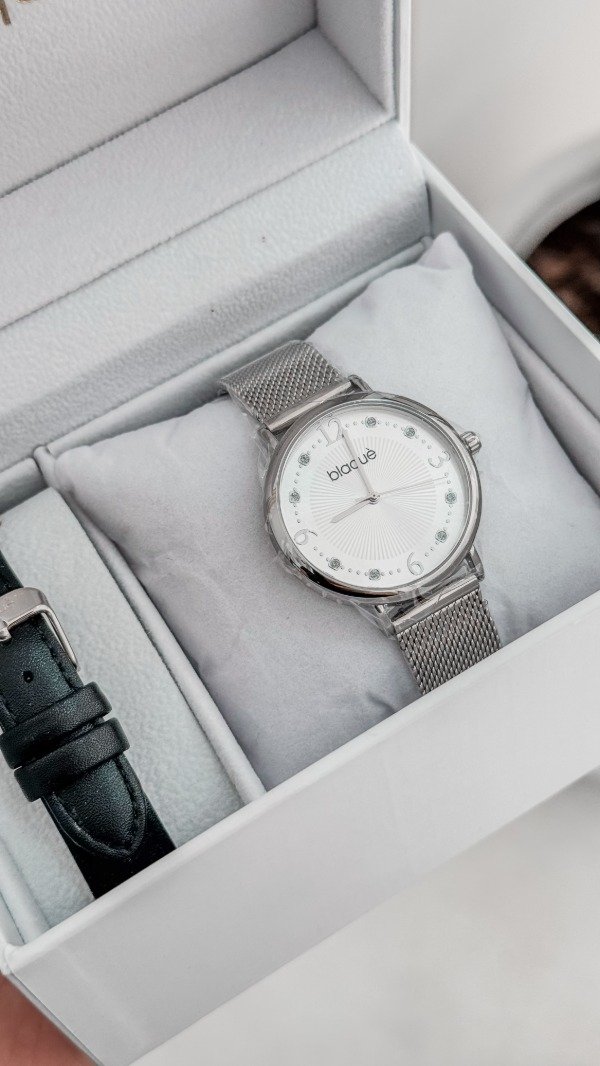RELOJ BLAQUÉ MALLA TEJIDA DE METAL, CON MALLA DE REGALO NEGRA DE CUERO.
